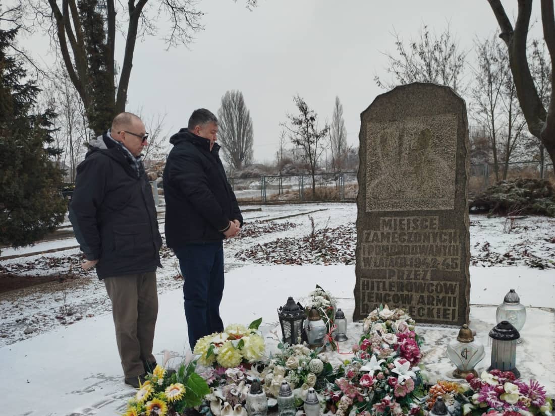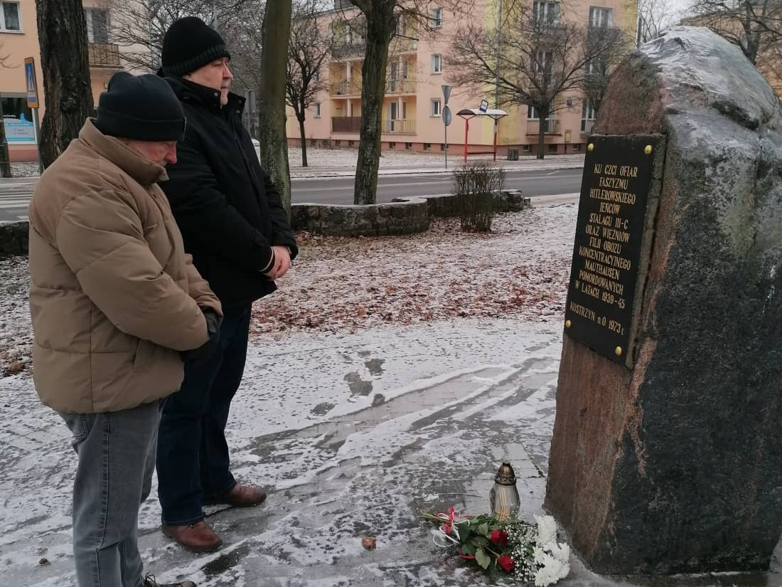 Am 30. Januar, dem Jahrestag der Befreiung des Stalag III C Alt Drewitz, besuchten wir vier solcher Orte in Kostrzyn, wo wir mit Blumengestecken den Ermordeten, Ausgehungerten, Erschossenen und auf dem Boden von Küstrin zu Tode gequälten Menschen gedachten. Neben dem Stalag befand sich ein Denkmal für die ermordeten sowjetischen Kriegsgefangenen auf dem städtischen Friedhof, ein Stein für die Kriegsgefangenen des Stalags und der Zweigstelle des Konzentrationslagers am Kreisverkehr Zatorze sowie eine Gedenktafel für die Opfer der Kriegsgefangenen- und Zwangsarbeitslager an der Wand des Gebäudes neben dem Eingangstor zur Firma Arctic Paper.