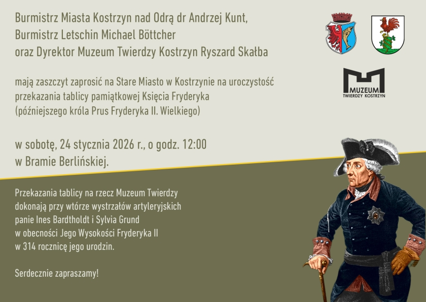 W ostatnim czasie zapadła decyzja o zwrocie tablicy. Jej przekazanie nastąpi w sobotę, 24 stycznia, o godz. 12:00 w Bramie Berlińskiej na Starym Mieście w Kostrzynie. Swą obecność zapowiedział Fryderyk Wielki ze świtą i artylerią oraz były mieszkaniec kamienicy przy ul. Szkolnej do 1945 r. Horst Herrmann z Oranienburga. Nastąpi to przy wtórze wystrzałów artyleryjskich naszej muzealnej armaty i odczytaniu odpowiednich dekretów królewskich.