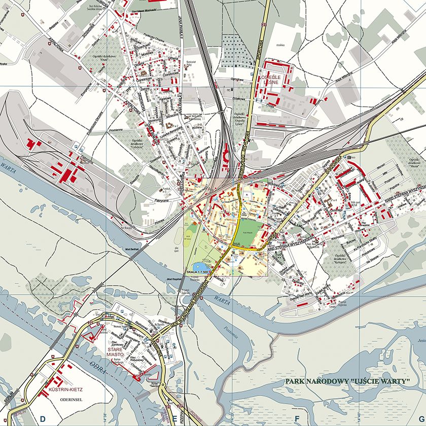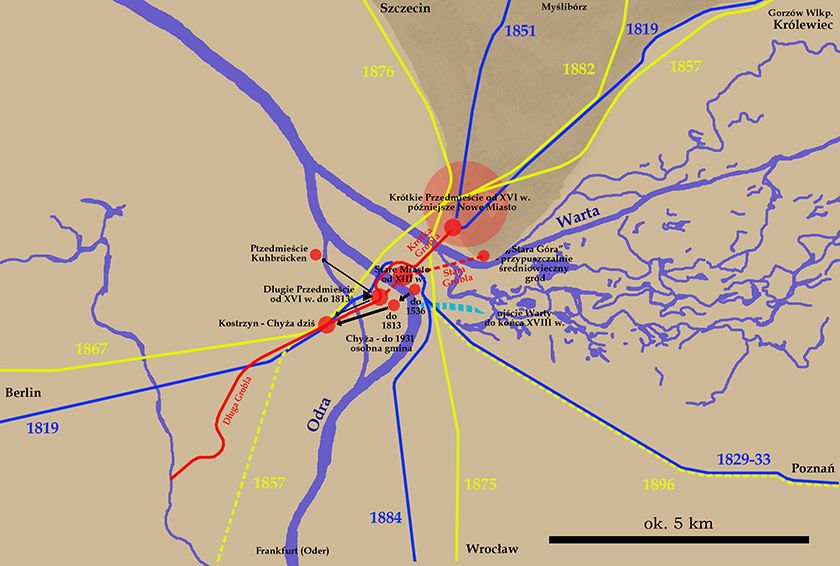 Twierdza jednak niczym magnes przyciągała nowe lądowe szlaki komunikacyjne: szosy (oznaczone na mapce kolorem niebieskim) oraz linie kolejowe (żółte; linią przerywaną oznaczono szlaki w międzyczasie zlikwidowane). Za ich sprawą miasto zyskało również trwałe połączenie z południowym brzegiem pradoliny i znaczenie nie tylko wojskowe, ale i gospodarcze. Wokół skrzyżowania linii kolejowych na Krótkim Przedmieściu wyrosło z czasem Nowe Miasto o przemysłowym obliczu - współczesny Kostrzyn jest przede wszystkim jego dziedzicem. U schyłku XIX w. mieszkało tutaj już i pracowało większość spośród ówcześnie ok. 15.000 Kostrzynian, podczas gdy wciąż zamknięte w murach twierdzy Stare Miasto zaczęło podupadać. Likwidacja części umocnień w XX w. dała tej dzielnicy nową szansę - zdawała się obiecywać przestrzenne scalenie rozrzuconego na dużej przestrzeni miasta, które miało wnet blisko 24.000 mieszkańców. Nowych możliwości nie udało się już jednak w pełni wyzyskać, zamiast tego całe miasto zostało w 1945 r. starte z powierzchni ziemi.